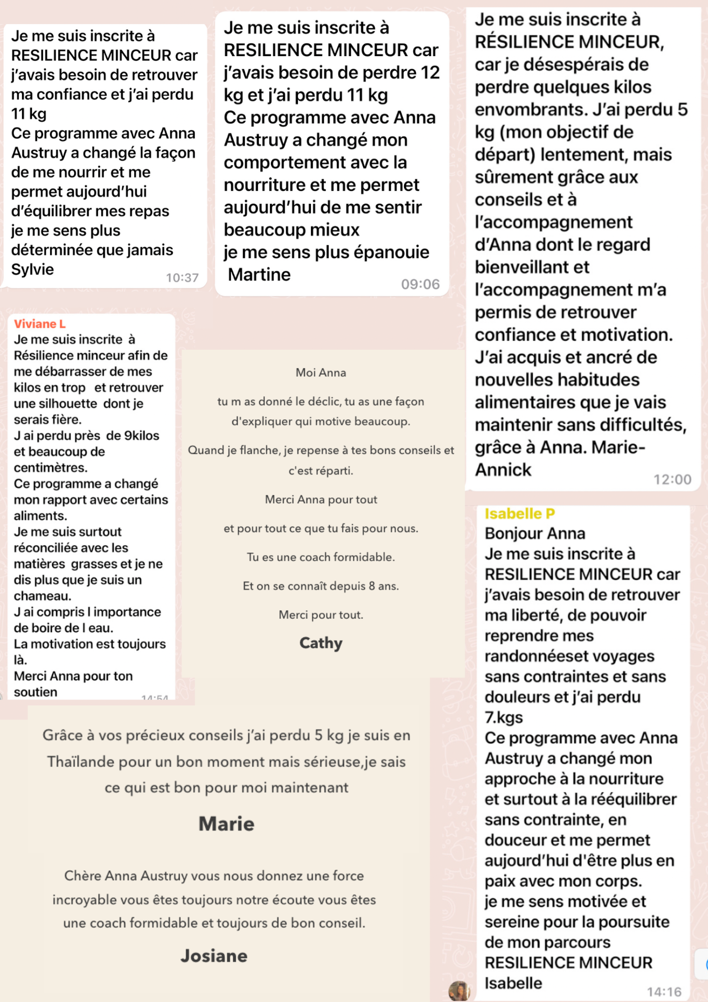 Ne manquez pas cette opportunité de transformer votre vie ! La prochaine session du programme Résilience Minceur est sur le point de commencer. Les places sont limitées afin de garantir un accompagnement de qualité.
